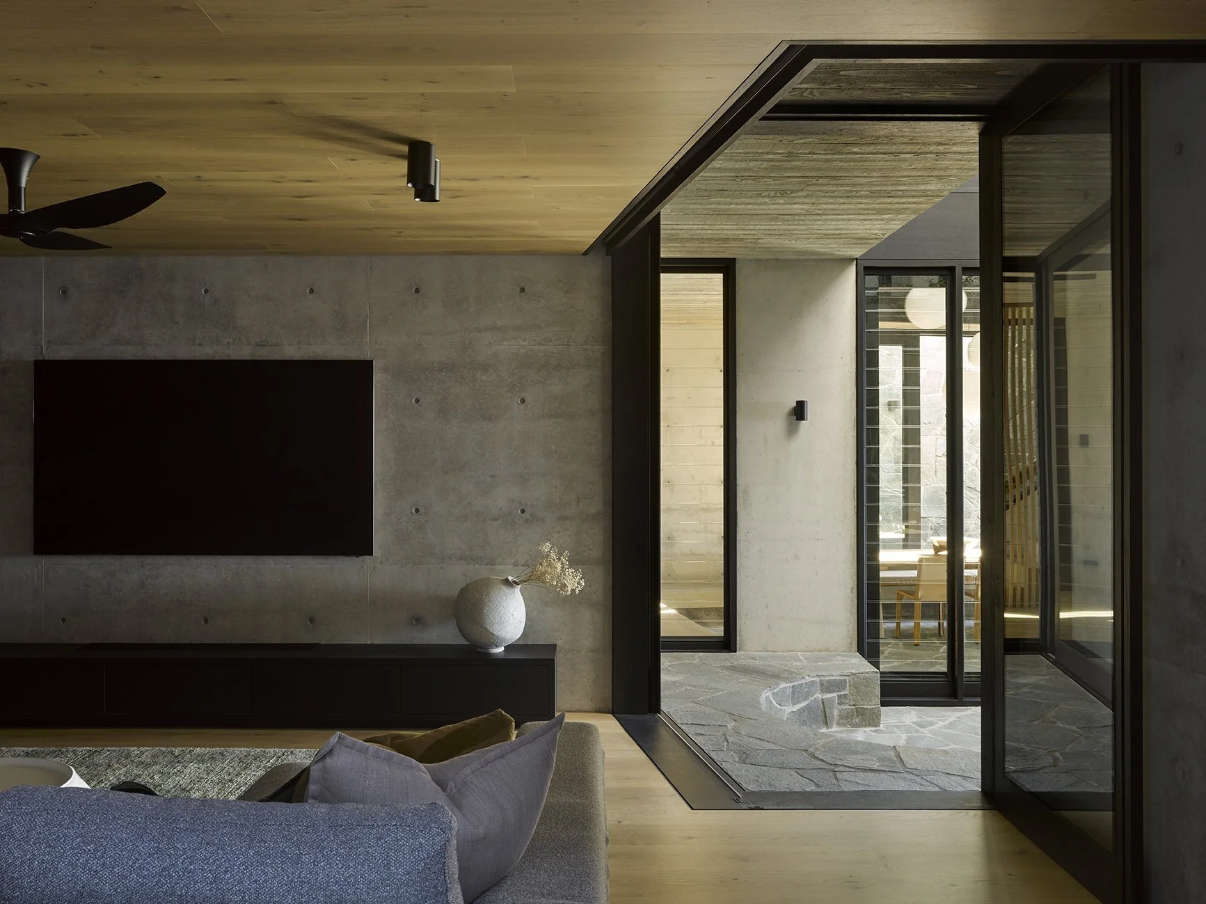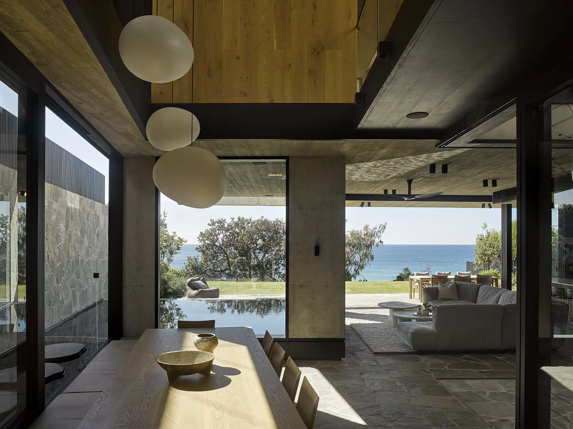 Materials are all tactile, robust and reflective of the context within which the house sits, manifested through the use of weathered timber, natural concrete and granite stone across the walls and floors, making no distinction between what is in, or outside. Arakoon is a home that incrementally reveals itself and offers a range of spatial, volumetric and architectural experiences to heighten this experience as it happens.