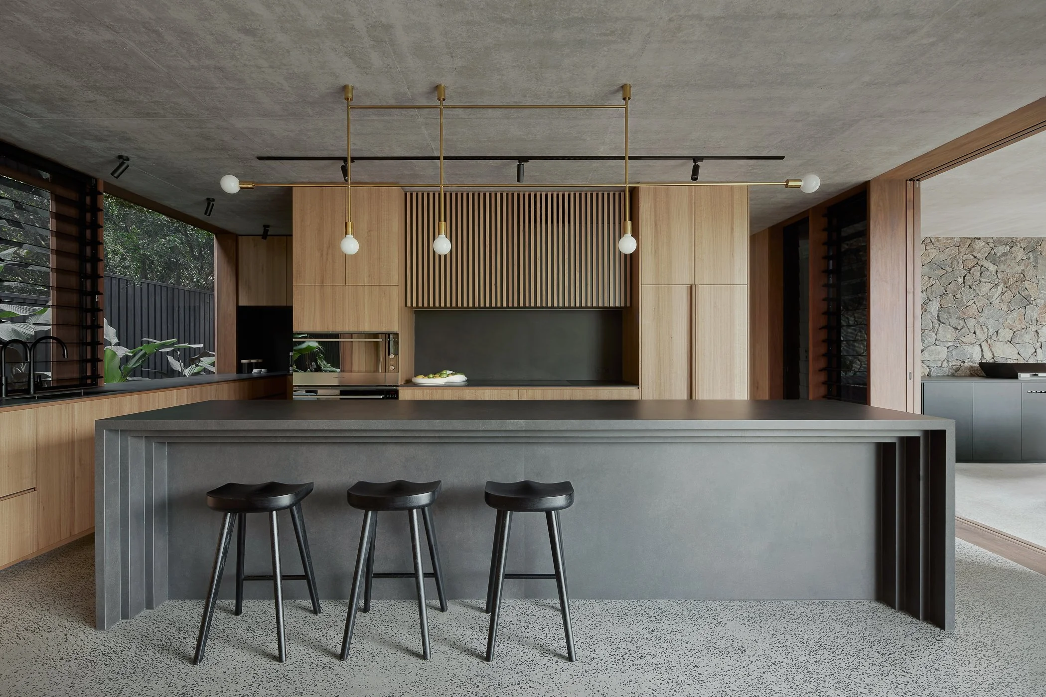 A strong emphasis on the landscape dominates the experience with the house itself, complimented by the muted tones of the built form, having prioritised natural materials along with the highly detailed concrete. All materials are intended to age gracefully in time as the landscape matures, yielding a living experience that is increasingly less about the building and more about the memory of the place itself.
