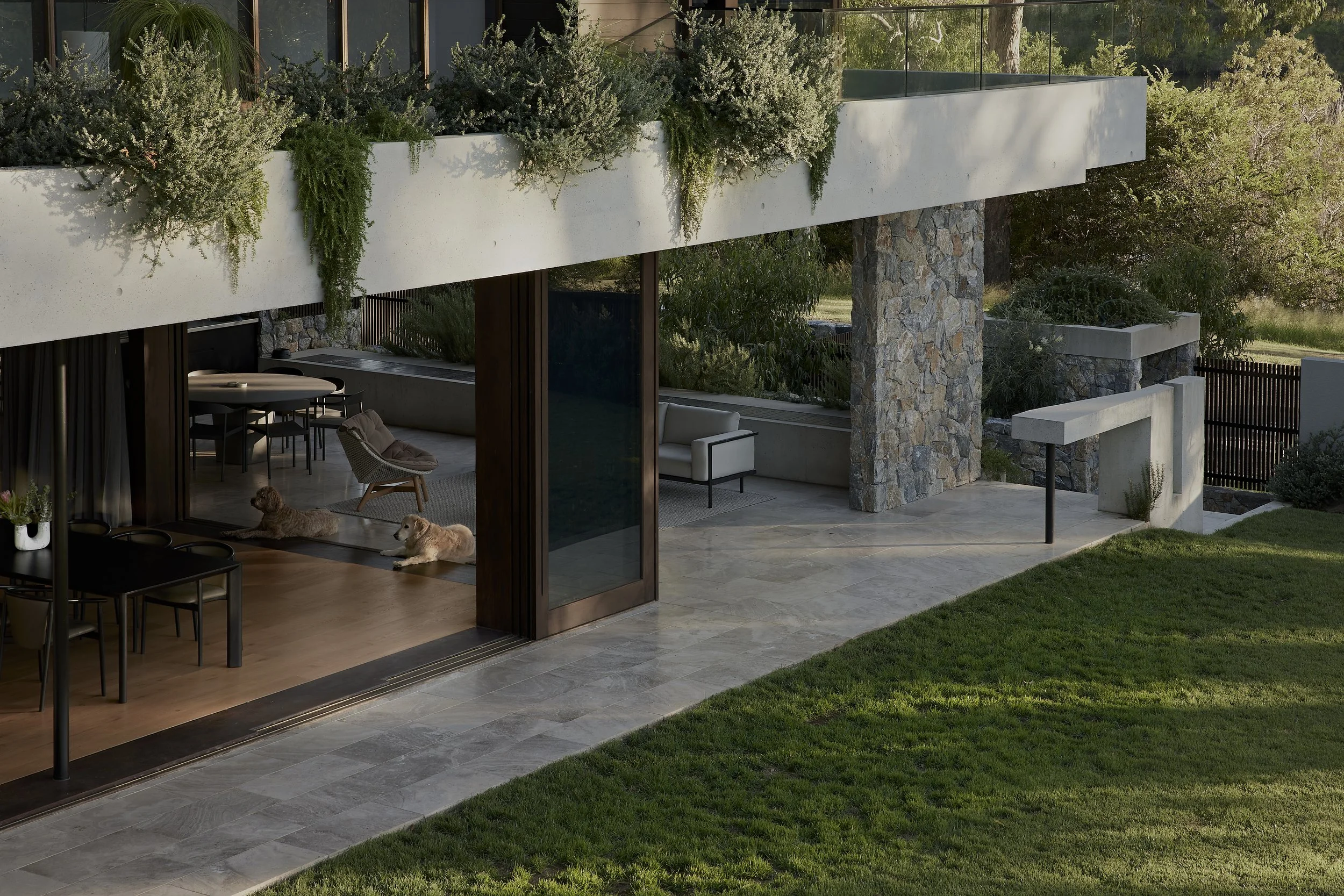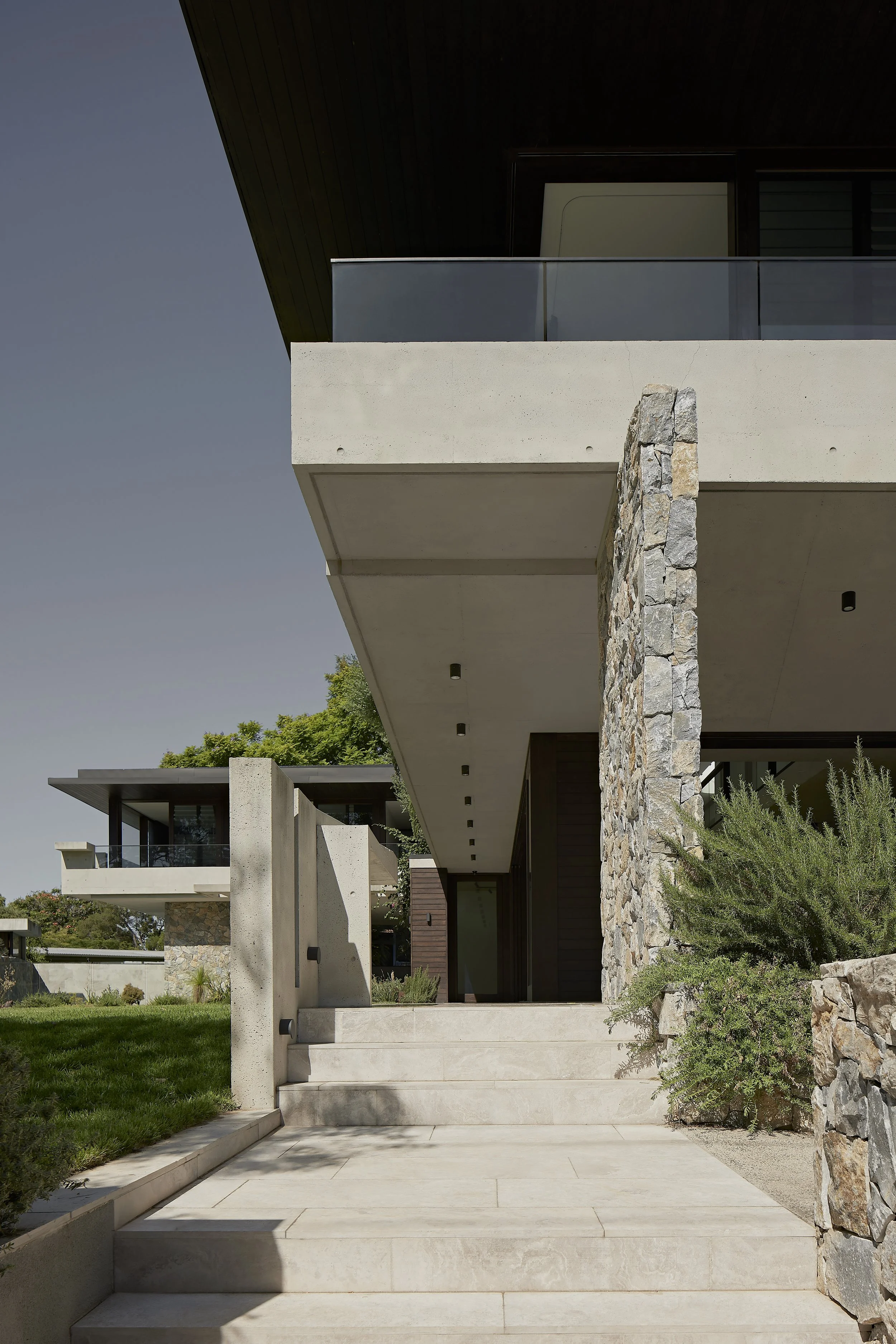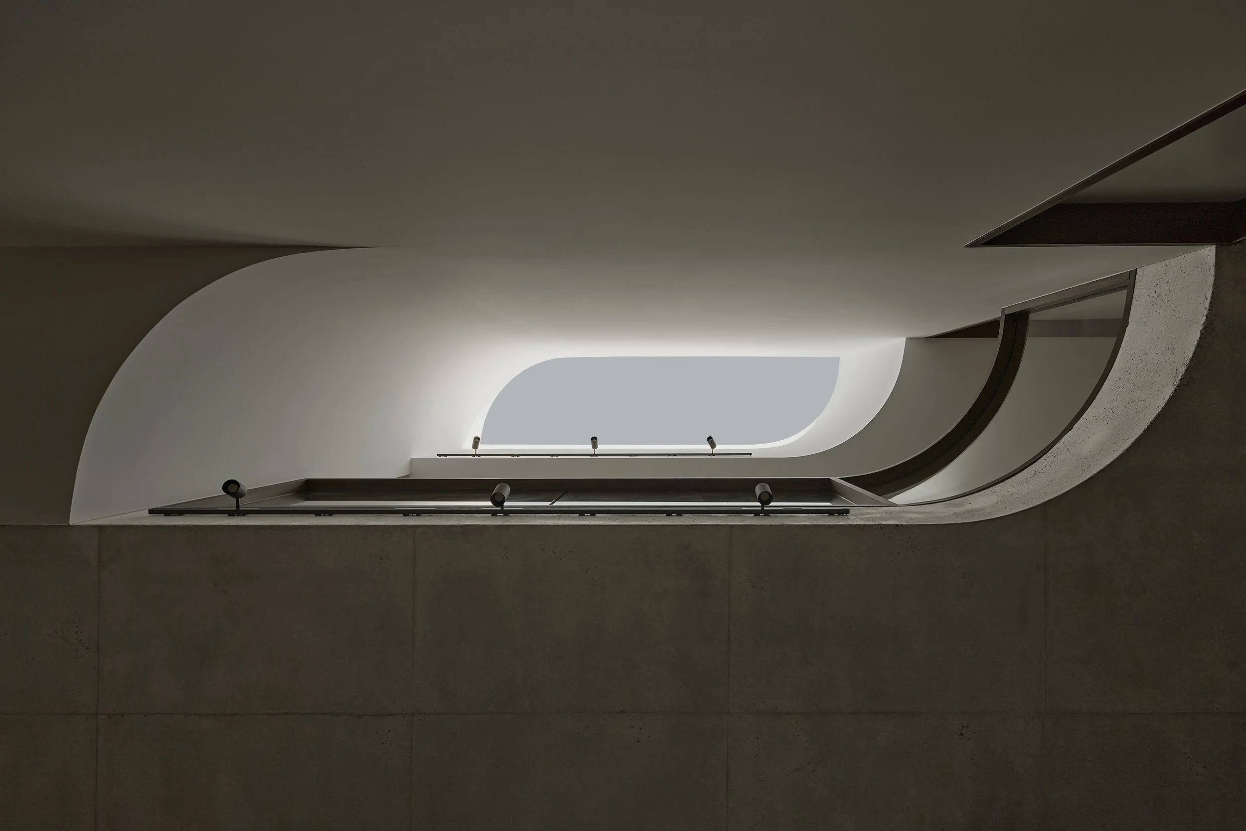 A rich, dark timber character provides a lovely, warm juxtaposition to the expansive sandblasted concrete and natural stone. The neutral, gallery-like character defines the interior of the house, once again punctuated by numerous sculptural voids and skylights. The complex accommodation program is concealed behind the strategically defined zones that create “homes” within the home, each articulated by stairs, voids, and sequence of views. A “double” pool provides for training and entertaining, the light from which floods the basement multipurpose room while also offering an unexpected theatre along the way. A few, small and quirky design elements, encompassing the client’s specific design brief, offer a scale respite and a unique design outcome for the home.
