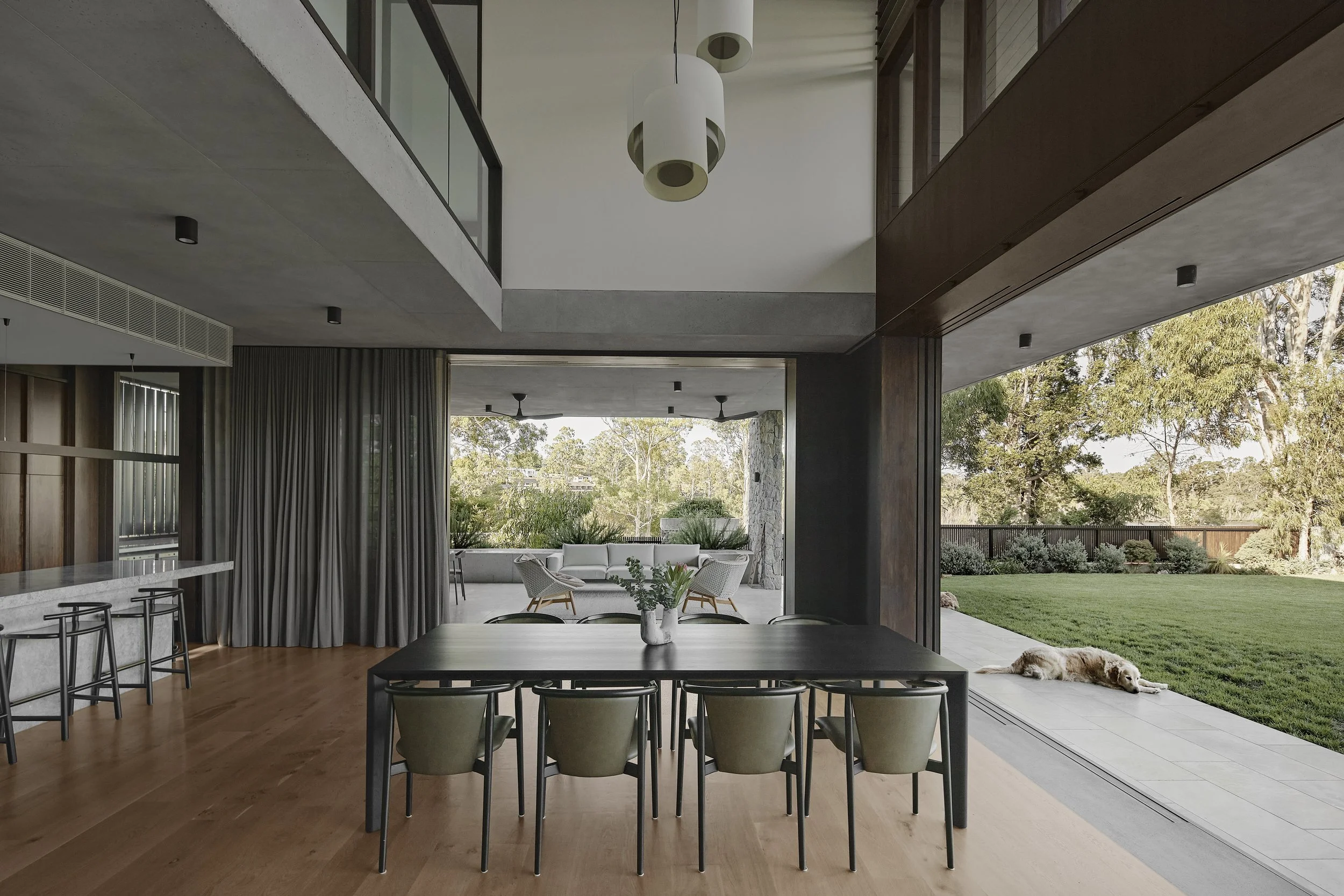 Mairwar (a Dungidau place name for the Brisbane River, meaning Platypus) is a riverfront home on a substantial block of land, affording a rare opportunity to design a family “compound” to serve the large, sporting, family. The house pushed well to the west, orientates around the large central garden and tennis court, which are elevated about the adjacent road and park, both to insulate the house from any future flooding, but also to create privacy and a sense of sanctuary at the same time. A maturing landscaping continues to adorn the house and shifts the balance from built to natural form.